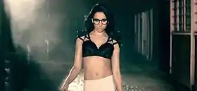 An image of Jodie Connor in the dark alley scene wearing just her bra and tights in the music video for "Bring It".