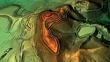 The ditch and counterscarp bank around the entire site covers three hills, although those to north and south are little more than spurs. With a perimeter of 6,800 feet (2,100 m), the defences enclose an area of around 44 acres (18 ha).[3] The first earthworks were around the base of the central hill otherwise known as the citadel. At least four pre-historic phases of building have so far been identified. Original gates appear to have existed to east, west and north-east.