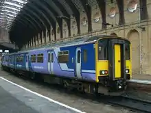 The British Rail Class 150 Sprinter is a class of diesel multiple unit passenger trains; they were developed and constructed by British Rail Engineering Limited at York Carriage Works between 1984 and 1987 for use on regional services across the UK. The type is a second-generation design, built to more modern standards and based on BR's Mark 3 body design for longer-distance services. It was developed alongside the lower-cost Pacers, which were built using bus parts, for use on short-distance services.[15] Two prototype units were built, followed by 135 production units in two batches. Subsequently, further members of the Sprinter family were also developed and introduced to service, including the Class 155, Class 156, Class 158 and Class 159.