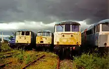 The remaining locomotives of the Class had relatively successful service lives of 25 to 30 years, although in their latter years they became unreliable, and displayed an increasing tendency to catch fire. However, a shortage of electric locomotives ruled out withdrawal of the fleet until the newer Class 90 locomotives came into service in the late-1980s.[7][9] The remaining examples were withdrawn from service in the late-1980s and early-1990s. The final examples were used for the transfer of empty coaches between London Euston and Willesden sidings between 1989 and 1991 following the withdrawal of the final Class 83's in that role. The last two examples withdrawn from service were 81012 and 81017 in July 1991. The majority of the class were scrapped at Coopers Metals in Sheffield.[7]