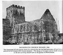 1826. The short shingled spire was taken down from tower. Three chapels, to the east of the north transept, were knocked down. The north transept was converted for use as a school, with a gallery. Box pews were installed in the nave. Galleries were built over both aisles.