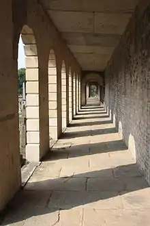 The site, previously market gardens, having been bought with the intervention of John Gunter of Fulham,[7] was 39 acres (160,000 m2) in area. Brompton Cemetery was eventually designed by architect, Benjamin Baud with at its centre, a modest sandstone domed chapel dated 1839, at it southern end, reached by two symmetrical long colonnades, now all Grade II* listed, in the style of St. Peter's Square in Rome, and flanked by catacombs.[8][9][10][11][12] It was intended to give the feel of a large open air cathedral. It is rectangular in shape with the north end pointing to the northwest and the south end to the southeast. It has a central "nave" which runs from Old Brompton Road towards the central colonnade and chapel. During the 4-year restoration project that began in 2014, an original Victorian flooring with Bath and York stone radial pattern was uncovered underneath the chapel carpet.[13]
