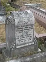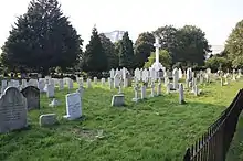 In the late 1880s when the nearby Earl's Court Exhibition Grounds played host to the American Show with Buffalo Bill, a number of Native American performers in the show, died while on tour in Britain.[21] The Sioux chief, Long Wolf, a veteran of the Oglala Sioux wars was buried here on 13 June 1892 having died age 59 of bronchial pneumonia. He shared the grave with a 17-month-old Sioux girl named White Star believed to have fallen from her mother's arms while on horseback. A British woman, Elizabeth Knight, traced his family 105 years later and campaigned with them to have his remains returned to the land of his birth.[22] In 1997, Chief Long Wolf was finally moved to a new plot at Wolf Creek Cemetery (ancestral burial ground of the Oglala Sioux tribe) in Pine Ridge, South Dakota.