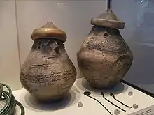 Accordingly, the large Lusatian urn fields were replaced by small, family size burial sites with several or more urns. The cist graves were now mostly flat, without mounds, forming a rectangle with up to two meter-long sides built of vertical slabs, containing the urns (sometimes as many as thirty and in separate compartments) inside and covered with another slab. Further south and east, as the Pomeranian culture expanded into central and southeastern Poland, there were also burials where the urn was placed under a globe or cloche, that is inside a large, spherical ceramic container, itself sometimes placed in a cist; areas with this arrangement are sometimes recognized as a distinct subculture (Cloche Grave culture).[39] Two types of funerary urns are peculiar to the Pomeranians, house-urns and face-urns. House-urns stand on several legs, have a large opening in front, come from an earlier period, the 7–6th century BC and mostly from the Lębork region. Face-urns from the same period are round, bulging containers with a unique and often realistic image of a face around the neck area and a hat-like lid, while the later ones tend to be less elaborate. Sometimes on the outside they were variously decorated, with tools and toilet accessories placed inside. Face-urns from the 650–450 BC period unearthed in Borucino, Kartuzy County and elsewhere present a rich assortment of engraved narrative scenes. Those include horse-drawn chariots that apparently depict the nightly trips of the sun-god through the underworlds, which symbolically represents the cyclical renewal of life; carts pulled by oxen and representing lunar symbolism are also present. Solar images were placed on the lids.[40] House- and face-urns are believed to represent Etruscan influence.[37]