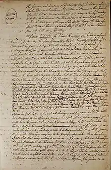 At the time of its creation, Brown's charter was a uniquely progressive document.[31] Other colleges had curricular strictures against opposing doctrines, while Brown's charter asserted, "Sectarian differences of opinions, shall not make any Part of the Public and Classical Instruction." The document additionally "recognized more broadly and fundamentally than any other [university charter] the principle of denominational cooperation."[11] The oft-repeated statement that Brown's charter alone prohibited a religious test for College membership is inaccurate; other college charters were similarly liberal in that particular.[32]