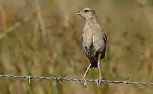Male brown songlarks are 23–25 cm long versus 18–19 cm for females, and may weigh 2.3 times as much.[7] The average weight of males was listed as 74.8 g (2.64 oz) and that of females is 32.4 g (1.14 oz).[8] They are probably the most sexually dimorphic passerine in the world in size difference, as well as likely the largest species in the family Locustellidae.[9] In general, the birds have a dusky pale-streaked with darker brown plumage and pale eyebrows. The underparts are brownish-white in the female, darker brown in the male. Breeding males may display a cinnamon colour. The eyes and bill are black, and the legs grey. Juveniles are smaller and paler with pinkish-brown bills. The call has been described as loud and creaky.[10] The male is the principal singer, calling from perches or when rising above breeding territory.[11]