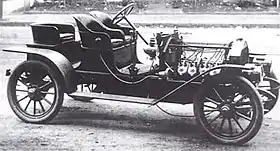 Buffums built between 1901 and 1904 were powered by 4-cylinder engines,[2]: 1612 but later in 1904 they built the Model G Greyhound, which was a racing model powered by two horizontal four-cylinder engines coupled together to make a flat-eight cylinder engine.[1] The Greyhound was the first 8-cylinder car offered for sale in the United States. In 1906 another eight-cylinder powered car was offered for sale, although this time the engine was a V8.[1]