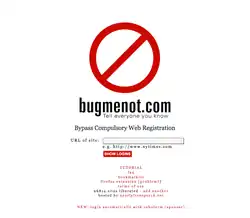 BugMeNot is an Internet service that provides usernames and passwords to let Internet users bypass mandatory free registration on websites. It was started in August 2003 by an anonymous person, later revealed to be Guy King,[1] and allowed Internet users to access websites that have registration walls (for instance, that of The New York Times) with the requirement of compulsory registration. This came in response to the increasing number of websites that request such registration, which many Internet users find to be an annoyance and a potential source of email spam.[2]
