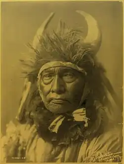 Bull Chief, born in 1825, Died February 4th 1914, was part of the Crow, or Apsaroke tribe.[2] He was interviewed by a man named Edward S. Curtis, who visited many tribes during the 20th century for interviews and to take portraits of the Natives. As a young man Bull Chief was never very successful when he was part of war-parties and always returned home without honor. He believed it was unnecessary for one to fast in order to be successful in a battle, and therefore opted not to fast.[2] Being so unsuccessful after returning from battle after battle, Bull Chief decided to climb Cloud Peak, which is the highest peak of the Bullhorn Mountains in Wyoming. Bull Chief stayed up on Cloud Peak for one day and one night hoping to have a vision, but having no luck he had to leave because mountain-rats were biting through his clothes and a fierce blizzard was causing hazardous conditions.[2] When Bull Chief returned home, his village was getting ready to be moved to a new location. Based on landmarks mentioned in the new location, it appears the tribe was moved near Red Lodge Creek, MT.[2] During this transition time, Bull Chief decided to continue trying to fast in order to have a vision. He fasted for four days and four nights, but still had no vision. After which, he tried two more times unsuccessfully. Seeing that his current attempts were failing, and all of the other men in his tribe counting coup he again decided to try something new. For this attempt, he went up to the head of Red Lodge Creek to fast for four days and for four nights in blinding snow.[2] This time his experience turned out much different from all of his previous attempts. He had a vision in which he, "Saw his own lodge and a splendid bay horse standing in front of it."[2] It was not explained as to what this vision meant, but thereafter Bull Chief began to do remarkably well in battles. Shortly after the vision, Bull Chief was able to get his first honor and started counting coupe frequently.[2] Counting coup is the highest honor for winning intertribal wars between Plains Indians. Bull Chief's determination and personal strength helped him to his successes as a hunter, in combat, and in spiritual pursuits.[3]