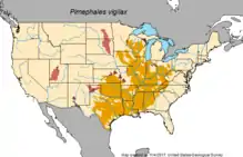 The bullhead minnow is mainly located in the southern United States, in the Gulf Coast of the United States and Mississippi River Basin. It can be found in the basin of the Mobile River, as well as connected backwaters, streams and rivers.[5] They are found more often in waters that typically have little to no movement, such as in river pools.[8] It is one of the 324 fish species found in Tennessee.[9] They have been introduced to the Osage River and Kansas River systems in Kansas, to the Missouri in Nebraska, the Rio Grande in New Mexico, Lake St Marys in Ohio, the James drainage in South Dakota, the Red River, Canadian River and Rio Grande in Texas and to the upper Fox River and possibly the Menomonee River in Wisconsin. They were probably introduced to these areas as bait fish carried by anglers. It has also been introduced to Utah where it occurs in two closed drainages within the Great Basin, that of the Sevier River, where it seems to have been introduced accidentally in releases of channel catfish (Ictalurus punctatus) imported from Texas in the 1950s, and of Lake Utah.[4]
