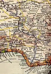 Bussa, also known as Boussa in older texts, was the capital of northern Borgu, in northern Nigeria. It was the farthest navigable point on the Niger River, just above the rapids.[1] The town site is now covered by Lake Kainji, which was created in 1968 with the construction of the Lake Kainji dam. The town was re-located to what is now called New Bussa.