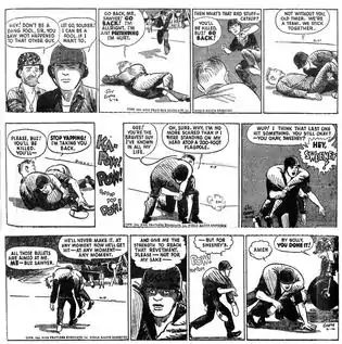 - I drew Wash Tubbs until 1943, when I started drawing Buz Sawyer. It was during World War II, so I decided to make Buz a Navy pilot. It promised lots of action, and I also felt that I would be making a contribution to the war effort. Before actually starting the strip, and to insure authenticity, I did a great deal of research. I’ve always loved to travel, so I went to many different places in search of information that I could use in the strip; I even spent some time aboard an aircraft carrier. In addition, I gathered together a very large collection of Navy photographs to use as background material. Rosco Sweeney, who is now featured on the entire Sunday page, was Buz’s wartime buddy. He was also the gunner on the Navy bomber which Buz flew. After the war, I had Sweeney start an orange grove in Florida… the same as I did. I have no plans for bringing Buz into the Sunday page. Action is one of the most important elements in a strip. In fact, I feel that graphic pictorialization is the essence of the comic strip medium and that is what makes it a unique art form. When newspapers cut the size of the comic strip until there is no room left for anything but dialogue, then that will be the end of comics. Buz is conceived four weeks in advance. My collaborator, Hank Schlensker, finishes the layouts from my rough drawings. He works approximately one week behind me. I am also assisted by Al Wenzel and Edwin Granberry. I own the rights to the strip. The rendering of Buz Sawyer is done with Craftint; a technique pioneered in this strip as well as in Wash Tubbs. I have always been interested in trying new techniques, and I especially try to capture a three-dimensional quality in the strip.[3]