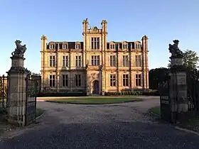 Edward Beevor, who built Bylaugh Hall, also assumed the name of Lombe. He was born in 1800 in Norwich. In 1826 he became an MP for Arundel. In 1831 he married Marie Rozer de St. Julien, who was French.[2] The couple had no children and spent most of their lives travelling abroad. In 1849, after a long delay, the Court of Chancery intervened, and ordered the use of the trust funds for their appointed purpose, and the architects Charles Barry, Jr. and Robert Richardson Banks were at length commissioned to design a suitable house. William Andrews Nesfield advised on the position of the house, and was responsible for laying out the grounds and gardens. The clock tower and surrounding buildings are vaguely reminiscent of the new Houses of Parliament which were designed by Sir Charles Barry, Sr. Along with the Houses of Parliament, it was amongst the first buildings ever to employ steel girders in the supporting structure. The exterior stonework, including the balustrades and the terrace walling, are of Magnesian Limestone. At that time the estate was the third largest in Norfolk, containing over 19,000 acres (77 km2).