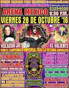 The CMLL Día de Muertos (2016) (Spanish for "Day of the Dead") is a professional wrestling supercard event, scripted and produced by the Mexican Lucha Libre promotion Consejo Mundial de Lucha Libre (CMLL). The show took place on October 28, 2016 in CMLL's main venue, Arena México, in Mexico City, Mexico and celebrated the Mexican Day of the Dead celebration. Many of the wrestlers working the show wore the traditional Día de Muertos face and body paint for the Día de Muerto event. From the fourth match on the losing wrestlers were be dragged to El Inframundo ("The Underworld"), a side entrance in the arena, by a group of wrestlers dressed up as minions of the ruler of the underworld.[2][1]