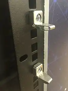 A cage nut or caged nut (also called a captive or clip nut) consists of a (usually square) nut in a spring steel cage which wraps around the nut. The cage has two wings that when compressed allow the cage to be inserted into the square holes, for example, in the mounting rails of equipment racks. When the wings are released, they hold the nut in position behind the hole. Cage nuts conforming to this description were patented in 1952 and 1953.[1][2] This design requires insertion tools to install the cage nut into the hole. Newer designs featuring a squeeze-and-release tab allow for tool-less installation.[3]