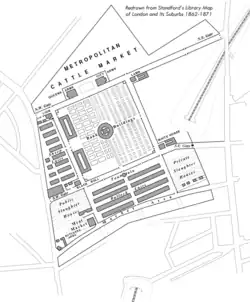 The northern part of the main market site was redeveloped by the Greater London Council (GLC) as the Market Estate and completed in 1967 to a design by architects Farber & Bartholomew.[2] On the western area where sheep were kept, the Corporation built the York Way Estate to designs by McMorran & Whitby and completed in 1969.[2] The southern area of the market, south of Market Road, where the cattle were kept and where the slaughter houses were is now sports pitches. The rest forms Caledonian Park.