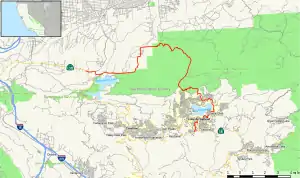 SR 173 begins at SR 138 just inside the Hesperia city limits and travels east near the shore of Silverwood Lake, passing near Cedar Springs Dam, several houses and ranches, and the historic Las Flores Ranch site. The road briefly turns north further into the Hesperia city limits, leaving the San Bernardino National Forest. SR 173 leaves the city and enters Mojave River Forks Regional Park, where it turns east and intersects Arrowhead Lake Road, which leads to the urban center of Hesperia. Once SR 173 intersects the Pacific Crest National Scenic Trail, it turns into a one-lane dirt road rising along the north face of the San Bernardino Mountains, first heading east to its apex before turning south to the Lake Arrowhead area. This one-lane dirt segment has been closed to traffic since March 2011.[2] The paved segment of SR 173 resumes northeast of Lake Arrowhead and enters the community of Cedar Glen, where it parallels the Lake Arrowhead shoreline and encounters Papoose Lake. The highway enters the community of Lake Arrowhead, where SR 173 intersects SR 189 and turns south to terminate at SR 18.[3]