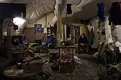 The camp started out with just a few tents in 2005.[10] However, from early 2006 personnel from 39 Engineer Regiment Royal Engineers and various contracting firms, all under the supervision of 62 Works Group Royal Engineers started to build the base with more robust facilities. In November 2006, the then British Prime Minister Tony Blair visited Camp Bastion, and, while addressing a gathering of British troops, described it as an "extraordinary piece of desert ... where the fate of world security in the early 21st century is going to be decided".[13]
