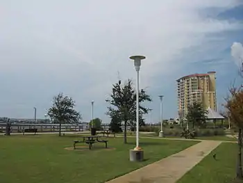 The community's name was officially changed from Fort Walton to Fort Walton Beach on June 15, 1953, by agreement with the state legislature in Tallahassee, and incorporated a portion of Santa Rosa Island formerly known as Tower Beach.[14] Tower Beach, named for a tall observation tower at the site which was later destroyed by a hurricane, had been an amusement area operated from 1928 by the Island Amusement Company by future-Fort Walton Beach mayor Thomas E. Brooks,[15] with a board walk, casino, restaurant, dance pavilion, "40 modernly equipped beach cottages",[16] and concession stands which was largely destroyed by fire on Saturday, March 7, 1942. Wartime supply restrictions prevented a reconstruction.[17] This 875-acre parcel of Santa Rosa Island with three miles of Gulf frontage was conveyed to Okaloosa County on July 8, 1950, in an informal ceremony at the county courthouse in Crestview, Florida. The county paid the federal government $4,000 to complete the transaction, the result of the efforts of Congressman Bob Sikes.[18] The portion of Santa Rosa Island transferred is now known as Okaloosa Island. The remaining Tower Beach summer cottages were removed after the 1955 tourist season as the new Okaloosa Island Authority redeveloped the site with a new hotel and casino. The government was changed to a city manager form.[13]