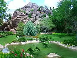 The Canada Pavilion is designed to remind guests of Canada's outdoors. It includes a canyon, a waterfall, gardens, a pool with fountains, and totem poles. Further in to the pavilion, beyond the rustic log cabins, a small thoroughfare is designed to represent the British and French influences and heritage through its buildings; the Hotel du Canada[1] dominates the skyline to the right whilst English cottages adorn the left. An iconic Gilbert-Scott telephone box stands to the side, and often there is a direct connection on this phone to the boxes in the United Kingdom pavilion nearby.[2]