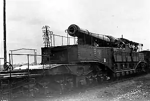 The guns consisted of a large rectangular steel base, which was suspended on two eight-axle articulated rail bogies manufactured by Schneider. The number of axles was determined by the weight limit for European railways of 17 tonnes per axle.[1] The carriage was similar to that used by the contemporary Obusier de 520 modèle 1916 produced by Schneider. Since the carriage did not have a traversing mechanism it was aimed by drawing the guns across a section of curved track. Once in firing position, a section of rail bed was reinforced with wood and iron beams to support the weight of the gun. Five steel beams under the center of the carriage were then lowered to lay across the tracks and the carriage was jacked up to take weight off the bogies and anchor the gun in place. There were another two beams located between the quadruple bogies on each end of the carriage.[2] When the gun fired the entire carriage recoiled a few feet and was stopped by the friction of the beams on the tracks. The carriage was then lowered onto its axles and was either pushed back into place with a shunting locomotive or a windlass mounted on the front of the carriage pulled the carriage back into position. This cheap, simple and effective system came to characterize Schneider's railway guns during the later war years and is known as the Glissement system.[2]