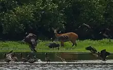 During the annual floods, deciduous forests are the only places where there is dry ground. They become the only feeding grounds available for bird species like the undulated tinamou, the bare-faced curassow, and the several species of wild pigeon that occur in Cantão. Many mammal species that don't do well on trees or in flooded areas also seek refuge in these forests, which consequently become prime hunting ground for the park's two large terrestrial predators, the jaguar and the puma.