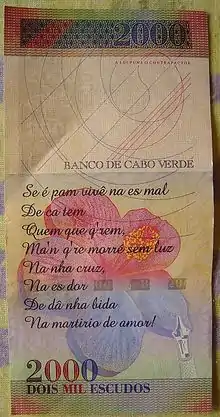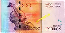 On 22 December 2014, the Banco de Cabo Verde introduced a new series of banknotes that honor Cape Verdean figures in the fields of literature, music, and politics. It consists of denominations of 200, 1,000 and 2,000 escudos issued in 2014, with the former now printed on polymer,[20] and banknotes of 500 and 5,000 escudos issued in 2015.[21]