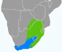 It is found in a wide range of densely to lightly wooded habitats in South Africa, Botswana, Lesotho, Eswatini and marginally in Mozambique. Most populations are resident, but some perform minor seasonal movements.