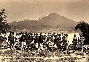 The Black Flags had thrown up an impressive series of fortifications around Hưng Hóa, but Millot made no attempt to attack the town's formidable defences. Having pinned the Black Flags frontally with General de Négrier's 2nd Brigade, he subjected Hưng Hóa to a ferocious artillery bombardment from Trung Hà with two 80-millimetre (3.1 in) and one 90-millimetre (3.5 in) artillery batteries. The bombardment began at 10:00 am on 11 April and lasted for several hours, setting many buildings inside Hưng Hóa alight and inflicting heavy casualties on the Black Flag defenders. The French did not suffer a single battle casualty. The soldiers of the 2nd Brigade spent the day in complete idleness, enjoying the warm spring sunshine and watching the smoke rise silently from Hưng Hóa as the French artillery methodically reduced the town to ruins.[2] While Millot's artillery bombarded Hưng Hóa, General Louis Brière de l'Isle's 1st Brigade successfully executed its flank march to the south of Hưng Hóa. On 11 April, seeing Brière de l'Isle's Turcos and marine infantry emerging behind their flank at Xuân Đồng, the Black Flags evacuated Hưng Hóa before they were trapped inside. They set alight the remaining buildings before they left, and on the following morning the French found the town completely abandoned.[3]