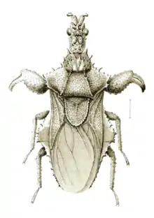Carcinocorini are a tribe of ambush bugs which are distinct in have a claw-like modification of the foreleg used to capture their prey. Such claw or chelae, which are common in crabs, are almost unknown in insects, present only in female wasps of the family Dryinidae. The name of the tribe is derived from the Greek karkinos for crab and coris for bug.[1]