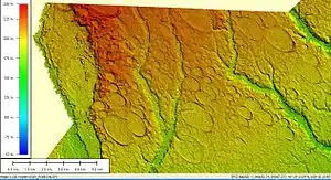 According to published papers and monographs,[2][12][13] the average trend of the long axes of Carolina Bays varies from N16°W in east-central Georgia to N22°W in southern South Carolina, N39°W in northern South Carolina, N49°W in North Carolina, and N64°W in Virginia. Within this part of the Atlantic Coastal Plain, the orientation of the long axes of Carolina bays varies by 10 to 15 degrees.[2][12][13] If the long axes of these Carolina bays, as measured by Johnson (1942), are projected westward, then they converge in the area of southeastern Indiana and southwestern Ohio.[2]