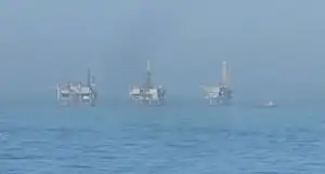 The Carpinteria Offshore Oil Field is an oil and gas field in Santa Barbara Channel, south of the city of Carpinteria in southern California in the United States. Discovered in 1964, and reaching peak production in 1969, it has produced over 106 million barrels of oil in its lifetime, and retains approximately 2 million barrels in reserve recoverable with present technology, according to the California State Department of Natural Resources.[1] Currently the field is produced from three drilling platforms four to five miles (8 km) offshore, within Federal waters outside of the tidelands zone. Two of the platforms are operated by Pacific Operators Offshore LLC (PACOPS), the operating arm of Carpinteria-based Carone Petroleum; the other platform is operated by Dos Cuadras Offshore Resources (DCOR). The Carpinteria field is the 50th largest field in California by total original oil in place, as of the end of 2008.[1]