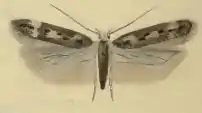 The wingspan is 11–13 mm. The forewings are dark brown, flecked with cream. There are three indistinct white transverse fasciae at one-quarter, one-half and four-fifths, mottled with light brown.[2] Adults are on wing in June.[3]