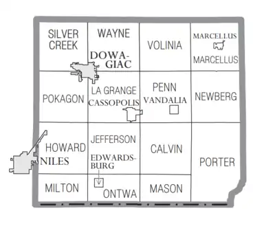 The village of Cassopolis was platted in 1831 and intended as the county seat, because it was the geographical center of the county. It had no settlers at the time.[7]