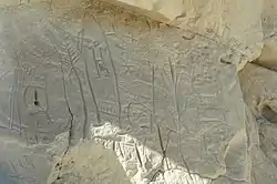 The Castle Gardens Petroglyph Site is a 6-mile (9.7 km) by 1-mile (1.6 km) region of vertical cliff faces in Fremont County, Wyoming, United States, with extensive petroglyph images incised in the rock faces. The glyphs include images of water turtles and circular shields, as well as human and animal figures.[2] The figures with circular shields are particular to the area, and are known as Castle Gardens Shield style images. A consensus of researchers is that the figures were carved by Athabaskans related to the Navajo and Apache, some time between 1000 AD and 1250 AD.[3] The site is being developed by the Bureau of Land Management, and may be visited.[4]