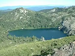 At higher elevations above the lake (especially in rocky or exposed locations), the pine and fir tree forests are thinner, and the trees grow in a more stunted fashion; instead, shrubs and bushes, such as green manzanita (Arctostaphylos patula), dwarf mountain manzanita (Arctostaphylos nevadensis), and tan oak (Lithocarpus densiflorus) find areas and niches to grow.[8] Other shrubs found around the lake are Sierra laurel (Leucothoe davisiae), and the lake is ringed with western azaleas (Rhododendron occidentale), which bloom mostly in June.