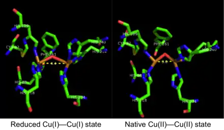 The crystal structure of catechol oxidase purified from Ipomoea batatas has been resolved in its active form in both the oxidized Cu(II)-Cu(II) state and the reduced Cu(I)-Cu(I) state.[11] It is a globular, single domain monomeric enzyme that is approximately 55 by 45 by 45 Å in size and ellipsoid in shape. A four α-helix bundle comprises the enzyme core, which girds the active site containing the dicopper center.[12] The nitrogens on the imidazole side chains of His88, His109, and His118 coordinate with the first catalytic copper while the nitrogens on the imidazole side chains on His240, His244 and His274 coordinate with the second catalytic copper ion. In the oxidized Cu(II)-Cu(II) state, each copper ion possesses a four coordinate trigonal pyramidal geometry, with the three histidine residues and a bridging hydroxide molecule forming the four ligands on each copper ion. Comparing the reduced (Cu(I)-Cu(I)) state with the native (Cu(II)-Cu(II)) state of the enzyme, the key difference is the distance between the two copper centers. In the oxidized Cu(II)-Cu(II) state, the Cu-Cu distance is 3.3 Å while in the reduced Cu(I)-Cu(I) state, the distance increases to 4.4 Å.[1]