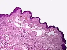 Microscopically, the vesicles in lymphangioma circumscriptum are greatly dilated lymph channels that cause the papillary dermis to expand. They may be associated with acanthosis and hyperkeratosis. There are many channels in the upper dermis which often extend to the subcutis (the deeper layer of the dermis, containing mostly fat and connective tissue). The deeper vessels have large calibers with thick walls which contain smooth muscle. The lumen is filled with lymphatic fluid, but often contains red blood cells, lymphocytes, macrophages, and neutrophils. The channels are lined with flat endothelial cells. The interstitium has many lymphoid cells and shows evidence of fibroplasia (the formation of fibrous tissue). Nodules (A small mass of tissue or aggregation of cells) in cavernous lymphangioma are large, irregular channels in the reticular dermis and subcutaneous tissue that are lined by a single layer of endothelial cells. Also an incomplete layer of smooth muscle also lines the walls of these channels. The stroma consists of loose connective tissue with a lot of inflammatory cells. These tumors usually penetrate muscle. Cystic hygroma is indistinguishable from cavernous lymphangiomas on histology.[4]