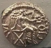Over 45,000 of the ancient British and Gaulish coins discovered in Britain have been recorded at the Oxford Celtic Coin Index.[7][8] The Trinovantian tribal oppidum of Camulodunon (modern Colchester) was minting large numbers of coins in the first centuries BC and AD, which have been found across Southern Britain.[9] Common motifs on the Camulodunon coins included horses and wheat/barley sheafs,[10] with the names of the rulers usually in Latin script, or more rarely in Greek.[10]