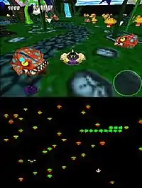 In the adventure campaign, one completes a series of levels linked by a storyline. Here, the player encounters both the original enemies (centipede, spider, flea, scorpion, poisonous mushroom) and a new array as well (dragonfly, butterfly, firebug, icebug, killer mushroom, etc.), some of which are capable of throwing projectiles to destroy the shooter, and others capable of altering mushrooms. If an enemy or projectile contacts the shooter, the player loses a life.