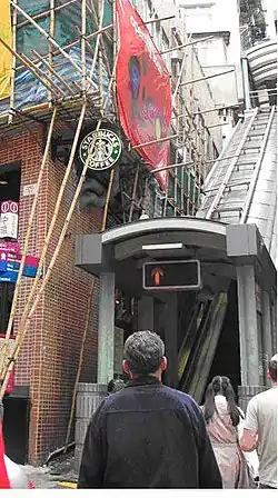 The Central-Mid-Levels escalator in Hong Kong is the longest outdoor covered escalator system in the world. The system is 800 metres (2,600 ft) long, connecting Des Voeux Road Central, in Central with Conduit Road in the Mid-Levels, passing through narrow streets in SoHo.