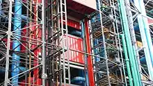 The Centre Pompidou (French pronunciation: [sɑ̃tʁ pɔ̃pidu]), more fully the Centre national d'art et de culture Georges-Pompidou (lit. 'National Georges Pompidou Centre of Art and Culture'), also known as the Pompidou Centre in English, is a complex building in the Beaubourg area of the 4th arrondissement of Paris, near Les Halles, rue Montorgueil, and the Marais. It was designed in the style of high-tech architecture by the architectural team of Richard Rogers, Su Rogers, Renzo Piano, along with Gianfranco Franchini.[1]