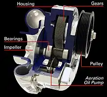 The four main components of a centrifugal supercharger are the volute (compressor housing), diffuser, impeller and transmission. Volutes are typically cast into a form from aluminum rather than other metals due to the combination of strength, weight, and resistance to corrosion. Volutes are then precision machined to match the impeller design.[6] Impellers are designed in many configurations, and Euler's pump and turbine equation plays an important role in understanding impeller performance.[7] Impellers are often formed by casting metals into a form and then machined, with the highest quality impellers machined from solid billet.