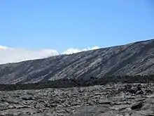 Between September and November 2014, work was carried out to reopen Chain of Craters Road, initially as a one-lane graveled surface, to serve as an emergency road for the residents of Lower Puna, who were in danger of being cut off if the June 27 flow had crossed Highway 130 at Pāhoa.[9][10] The flow ultimately stalled on the outskirts of Pāhoa, however, removing the immediate threat, and the route was again buried by lava by the "61G" flow in 2016. The 2018 lower Puna eruption prompted a similar repair, but the road remains closed to non-emergency use by automobiles.