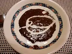 ![]() ![]() Top: A bowl of champorado with milk; Bottom: Tabliya, locally made tablets of pure chocolate made from fermented, toasted, and ground cocoa beans | |||||||