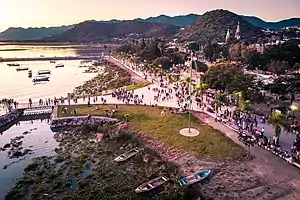 Tony Burton describes early tourism in his book “Lake Chapala through the ages: an anthology of travellers' tales.”[4] Chapala, along with its namesake lake, is well established as a weekend getaway destination primarily for inhabitants of the city of Guadalajara. Most of the area's expatriate population (originating primarily from the United States and Canada) reside not in the city proper but in and around Ajijic, a village of approximately 11,000 inhabitants located approximately 5 miles west of Chapala. Many of these residents stay for a long time, and some try to make Chapala like "home."