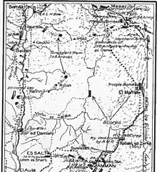 Between 6,000 and 7,000 German and Ottoman soldiers from the Ottoman Fourth, Seventh and Eighth Armies had managed to retreat via Tiberias or Deraa, before these places were captured on 25 and 27 September, respectively.[5][6] At this time, the retreating columns which moved via Deraa were at or north of Muzeirib on their way to Damascus.[6]