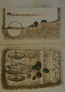In England, chariot burials are characteristic of, and almost confined to, the Iron Age Arras culture associated with the Parisii tribe. Finds of such burials are rare, and the persons interred were presumably chieftains or other wealthy notables. The Wetwang Slack chariot burial of c. 300 BC is unusual in that a woman was interred with the chariot.[7] In 2017 another chariot burial was unearthed in Pocklington, in the East Riding of Yorkshire, dated to BC 320 to 174. This was the first chariot burial in the UK to have been found with horses also interred. In addition to pony skeletons, the remains of the presumed driver were found, along with iron fragments from the chariot's body. A bronze shield in the grave was exceptionally well preserved.[8][9][10] "The discoveries are set to widen our understanding of the Arras (Middle Iron Age) culture and the dating of artefacts to secure contexts is exceptional," said Paula Ware, managing director at MAP Archaeological Practice Ltd.[11]
