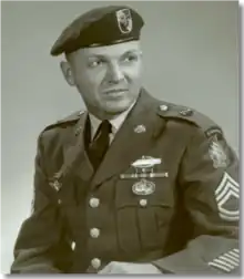 Born on May 12, 1924, in Ramsey, New Jersey, Hosking left high school to join the Canadian Army in 1941 when he was 16 years old and was discharged one month later for being underage. With his grandfathers permission, he joined the U.S. Coast Guard at the age of 17. After serving beach patrol duties he was discharged from the Coast Guard because of a heart condition in December 1942. Still wanting to serve and with the assistance of his congressman he was inducted into the Army on May 1, 1943.[2] During World War II, Hosking served first with the 69th Infantry Division, then with the 509th Parachute Infantry Battalion.[3] He served in Vietnam as a sergeant first class in Company A of the 5th Special Forces Group (Airborne), 1st Special Forces Regiment. On March 21, 1967, he was working as an advisor to a Civilian Irregular Defense Group battalion in Đôn Luân district, Phuoc Long Province, when a Viet Cong sniper was captured. As Hosking prepared to transport the prisoner to base camp, the man grabbed a hand grenade from Hosking's belt, armed it, and ran towards the 4-man company command group. Hosking tackled the prisoner and held him to the ground, using the prisoner's body and his own to shield others from the grenade blast. Both he and the Viet Cong prisoner were killed in the ensuing explosion. Hosking was posthumously promoted to master sergeant and awarded the Medal of Honor for this action.[4]