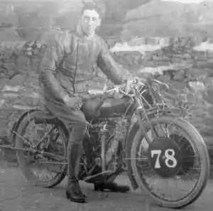 Franklin began racing Indian motorcycles in 1910, and competed on one in the Tourist Trophy in May of that year.[15] The riders of Indians at that race had persistent tyre problems; Franklin and three other Indian riders had tyre failures and did not finish.[16] That August Franklin left his job at the Rathmines power station and became a dealer in Indian motorcycles.[17] He rode and tuned Indians exclusively from then on. In June 1912 he rode an Indian eight-valve model at Brooklands to become the first man to cover 300 miles in 300 minutes.[18]